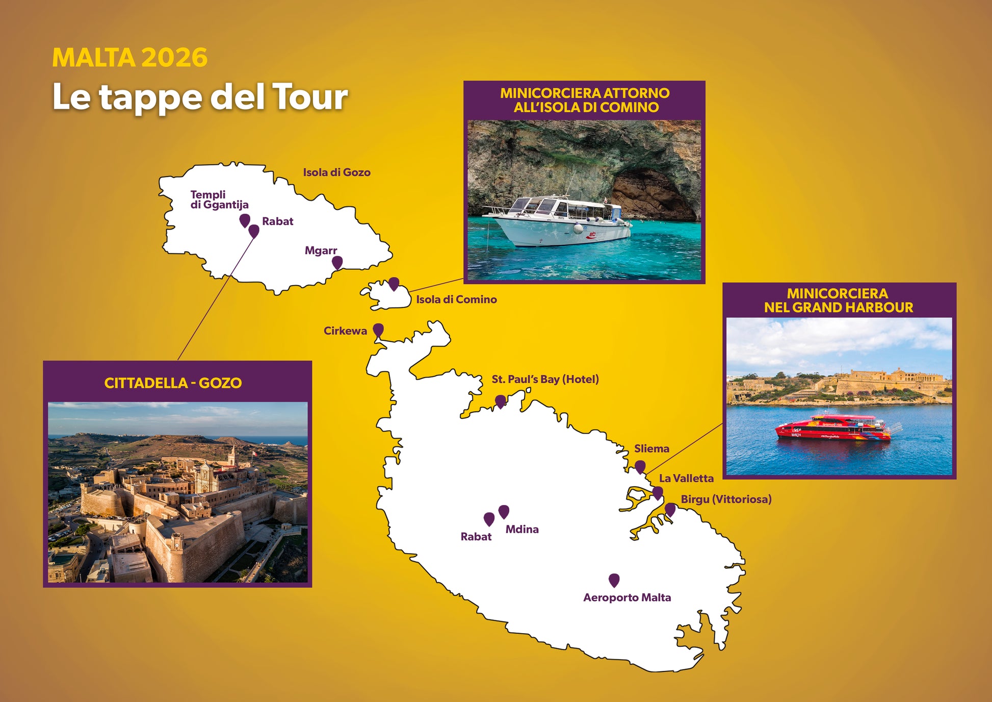 Prima colazione in hotel. Partenza in Bus G.T. per il nord dell’isola fino a Cirkewwa. Imbarco sul traghetto per Gozo, l’isola sorella di Malta, più intima e selvaggia. Tour con bus privato locale per la visita dei Templi di Ggantija, patrimonio UNESCO, tra i più antichi luoghi di culto al mondo. Proseguimento per la suggestiva Cittadella e il centro storico di Rabat, autentico cuore della vita gozitana. Pranzo in ristorante. Nel pomeriggio imbarco a Mgarr per un’affascinante minicrociera attorno all’isola di Comino, celebre per le sue grotte marine e acque turchesi. Possibilità di sosta bagno, condizioni permettendo. Rientro in serata al porto di Cirkewwa. Trasferimento in hotel, cena e pernottamento.
